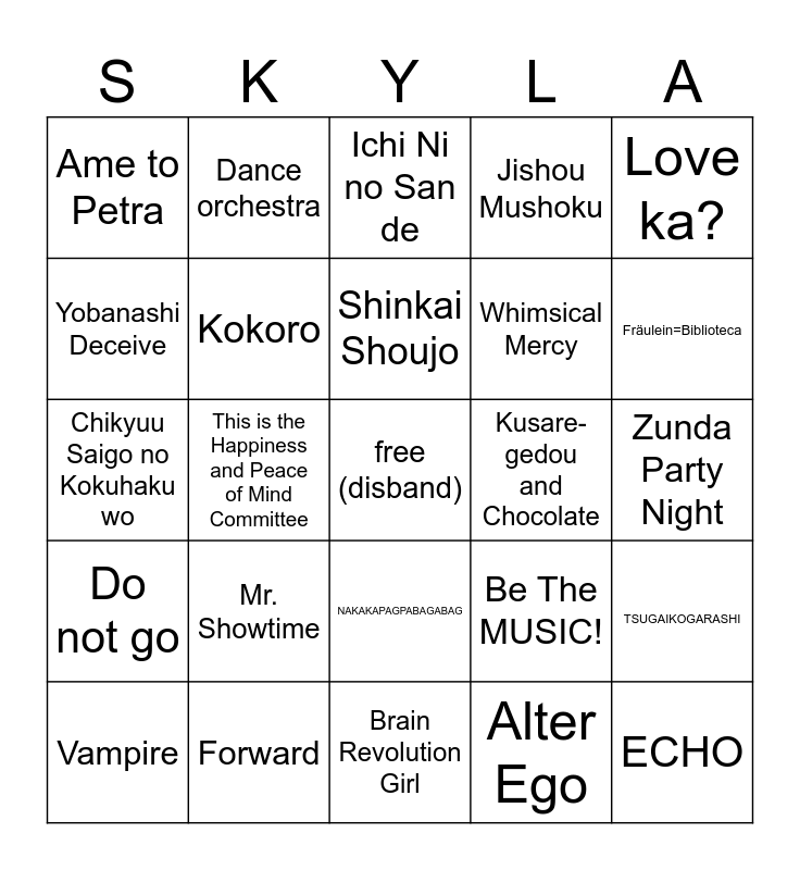 This bingo card has a free space and 24 words: Mr. Showtime, Forward, Shinkai Shoujo, Vampire, Love ka?, Ame to Petra, Yobanashi Deceive, Dance orchestra, Kusare-gedou and Chocolate, NAKAKAPAGPABAGABAG, Whimsical Mercy, Chikyuu Saigo no Kokuhaku wo, Be The MUSIC!, TSUGAIKOGARASHI, Kokoro, Alter Ego, Zunda Party Night, Ichi Ni no San de, Fräulein=Biblioteca, This is the Happiness and Peace of Mind Committee, ECHO, Do not go, Jishou Mushoku and Brain Revolution Girl.