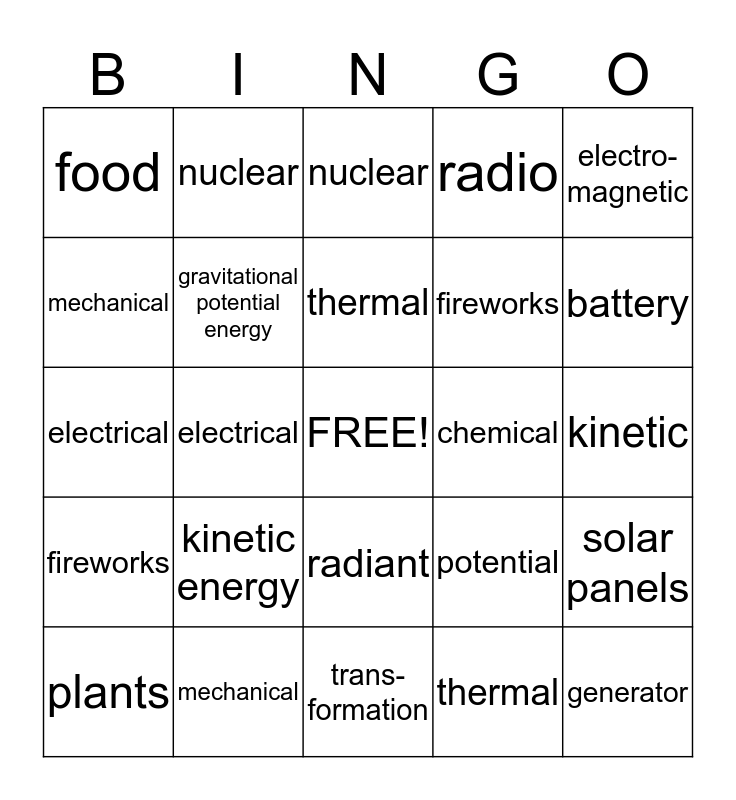 This bingo card has a free space and 24 words: kinetic energy, mechanical, thermal, plants, electro-magnetic, food, mechanical, nuclear, chemical, radiant, fireworks, electrical, potential, solar panels, gravitational potential energy, thermal, kinetic, nuclear, battery, electrical, generator, fireworks, radio and trans-formation.
