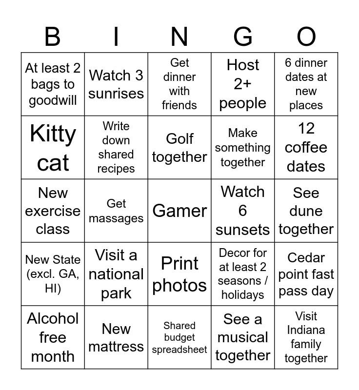 This bingo card has a free space and 24 words: Visit a national park, New mattress, Golf together, Alcohol free month, 6 dinner dates at new places, At least 2 bags to goodwill, Kitty cat, Watch 3 sunrises, Watch 6 sunsets, Print photos, Make something together, New exercise class, Decor for at least 2 seasons / holidays, Cedar point fast pass day, Write down shared recipes, See a musical together, See dune together, Get dinner with friends, 12 coffee dates, Get massages, Visit Indiana family together, New State (excl. GA, HI), Host 2+ people and Shared budget spreadsheet.