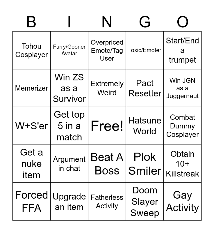 This bingo card has a free space and 24 words: Argument in chat, Upgrade an item, Extremely Weird, Forced FFA, Start/End a trumpet, Tohou Cosplayer, Memerizer, Furry/Gooner Avatar, Hatsune World, Beat A Boss, Pact Resetter, W+S'er, Plok Smiler, Obtain 10+ Killstreak, Win ZS as a Survivor, Doom Slayer Sweep, Combat Dummy Cosplayer, Overpriced Emote/Tag User, Win JGN as a Juggernaut, Get top 5 in a match, Gay Activity, Get a nuke item, Toxic/Emoter and Fatherless Activity.