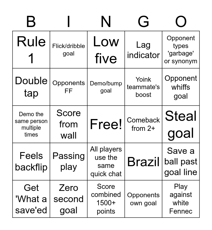 This bingo card has a free space and 24 words: Passing play, Zero second goal, Demo/bump goal, Get 'What a save'ed, Opponent types 'garbage' or synonym, Rule 1, Double tap, Flick/dribble goal, Comeback from 2+, All players use the same quick chat, Yoink teammate's boost, Demo the same person multiple times, Brazil, Save a ball past goal line, Opponents FF, Opponents own goal, Steal goal, Low five, Opponent whiffs goal, Score from wall, Play against white Fennec, Feels backflip, Lag indicator and Score combined 1500+ points.