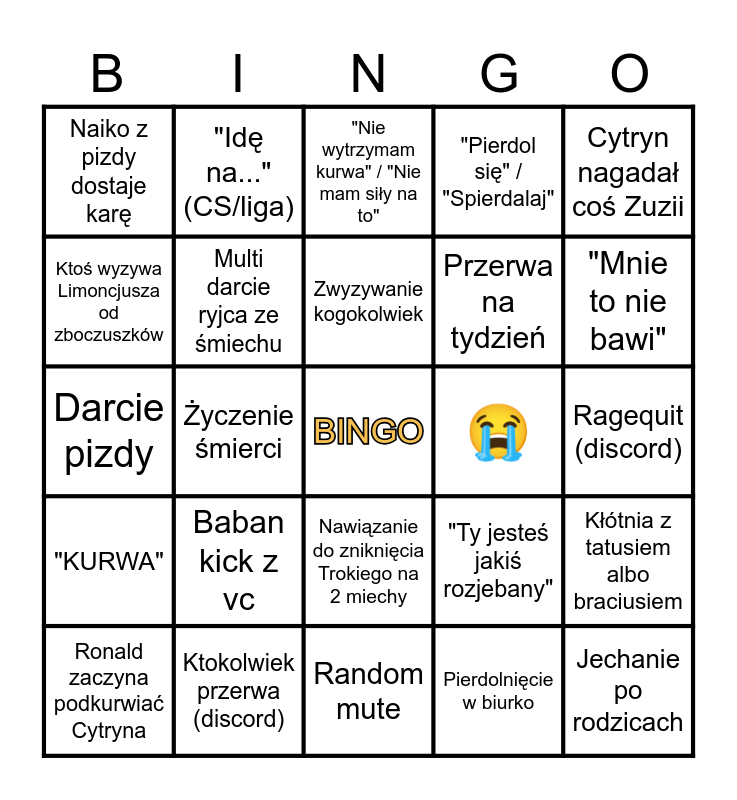 This bingo card has a free space and 24 words: Baban kick z vc, Ktokolwiek przerwa (discord), Zwyzywanie kogokolwiek, Ronald zaczyna podkurwiać Cytryna, Cytryn nagadał coś Zuzii, Naiko z pizdy dostaje karę, Ktoś wyzywa Limoncjusza od zboczuszków, "Idę na..." (CS/liga), 😭, Nawiązanie do zniknięcia Trokiego na 2 miechy, Przerwa na tydzień, Darcie pizdy, "Ty jesteś jakiś rozjebany", Kłótnia z tatusiem albo braciusiem, Multi darcie ryjca ze śmiechu, Pierdolnięcie w biurko, Ragequit (discord), "Nie wytrzymam kurwa" / "Nie mam siły na to", "Mnie to nie bawi", Życzenie śmierci, Jechanie po rodzicach, "KURWA", "Pierdol się" / "Spierdalaj" and Random mute.