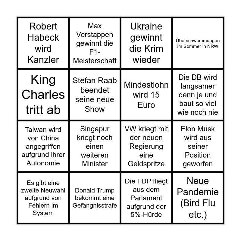 This bingo card has 16 words: Donald Trump bekommt eine Gefängnisstrafe, Elon Musk wird aus seiner Position geworfen, Ukraine gewinnt die Krim wieder, Robert Habeck wird Kanzler, Taiwan wird von China angegriffen aufgrund ihrer Autonomie, Max Verstappen gewinnt die F1-Meisterschaft, VW kriegt mit der neuen Regierung eine Geldspritze, Die FDP fliegt aus dem Parlament aufgrund der 5%-Hürde, King Charles tritt ab, Stefan Raab beendet seine neue Show, Es gibt eine zweite Neuwahl aufgrund von Fehlern im System, Überschwemmungen im Sommer in NRW, Singapur kriegt noch einen weiteren Minister, Die DB wird langsamer denn je und baut so viel wie noch nie, Mindestlohn wird 15 Euro and Neue Pandemie (Bird Flu etc.).