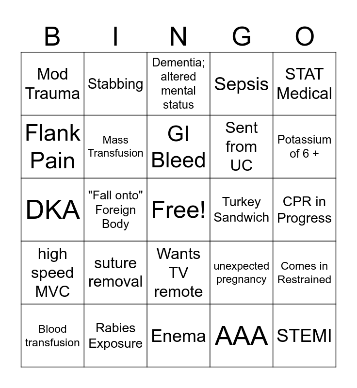 This bingo card has a free space and 24 words: suture removal, Rabies Exposure, GI Bleed, Blood transfusion, STAT Medical, Mod Trauma, Flank Pain, Stabbing, Turkey Sandwich, Wants TV remote, Sent from UC, DKA, unexpected pregnancy, Comes in Restrained, Mass Transfusion, AAA, CPR in Progress, Dementia; altered mental status, Potassium of 6 +, "Fall onto" Foreign Body, STEMI, high speed MVC, Sepsis and Enema.