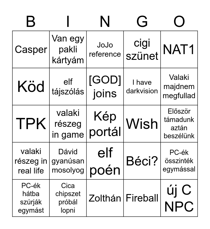 This bingo card has a free space and 35 words: Dávid kiég, Inkább a kurvák vére folyjon, VAL poénok, elf tájszólás, elf poén, cigi szünet, Köd, Baba kockát lop, [GOD] joins, Valaki meghal, TPK, NAT1, NAT20, Daddy Colton, Casper, Wish, Fireball, valaki részeg in game, valaki részeg in real life, új C NPC, Béci?, PC-ék hátba szúrják egymást, PC-ék összinték egymással, Cica chipszet próbál lopni, JoJo reference, Valaki majdnem megfullad, Habos babos, Mi vagyunk a D.I.C.K., I have darkvision, Először támadunk aztán beszélünk, Szeksz, Zolthán, Dávid gyanúsan mosolyog, Van egy pakli kártyám and Arch fasza.