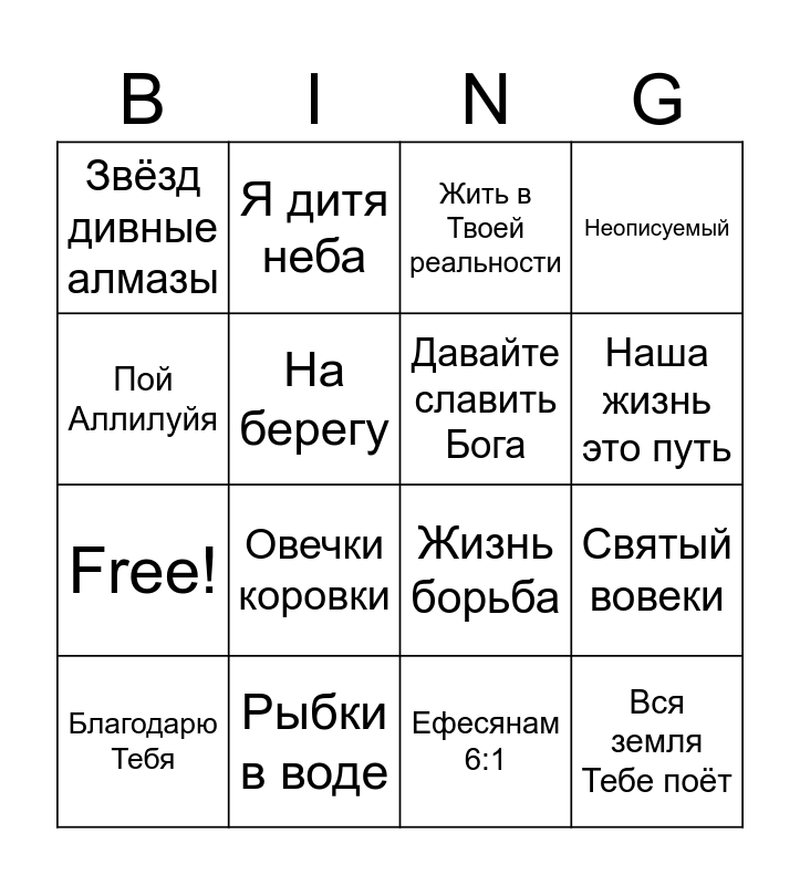 This bingo card has 25 words: Free!, Лев Иудин, Овечки коровки, Тот кто больше чем небеса, Неописуемый, Звёзд дивные алмазы, Я дитя неба, Жить в Твоей реальности, Святый вовеки, Благодарю Тебя, Рыбки в воде, Жизнь борьба, Любовь Христа, Гори прекрасная звезда, На берегу, Иисус Ты жизнь моя, Вся земля Тебе поёт, Пой Аллилуйя, Всех вас с Рождеством, Ефесянам 6:1, Наша жизнь это путь, Славь душа Господа, Прославлю в долине, Давайте славить Бога and Господь Твоя любовь.