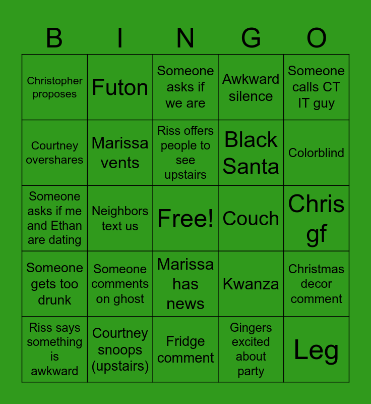 This bingo card has a free space and 24 words: Someone comments on ghost, Courtney snoops (upstairs), Riss offers people to see upstairs, Riss says something is awkward, Someone calls CT IT guy, Christopher proposes, Courtney overshares, Futon, Couch, Marissa has news, Black Santa, Someone asks if me and Ethan are dating, Kwanza, Christmas decor comment, Marissa vents, Gingers excited about party, Chris gf, Someone asks if we are, Colorblind, Neighbors text us, Leg, Someone gets too drunk, Awkward silence and Fridge comment.