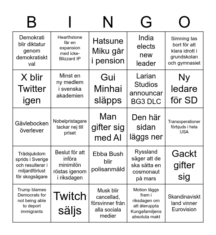 This bingo card has a free space and 24 words: Beslut för att införa minimilön röstas igenom i riksdagen, Twitch säljs, Gui Minhai släpps, Trump blames Democrats for not being able to deport immigrants, Simning tas bort för att klara idrott i grundskolan och gymnasiet, Demokrati blir diktatur genom demokratiskt val, X blir Twitter igen, Hearthstone får en expansion med icke-Blizzard IP, Den här sidan läggs ner, Ebba Bush blir polisanmäld, Larian Studios announcar BG3 DLC, Gävlebocken överlever, Ryssland säger att de ska sätta en cosmonaut på mars, Gackt gifter sig, Minst en ny medlem i svenska akademien, Motion läggs fram i riksdagen om att återuppta Kungafamiljens absoluta makt, Transoperationer förbjuds i hela USA, Hatsune Miku går i pension, Ny ledare för SD, Nobelpristagare tackar nej till priset, Skandinaviskt land vinner Eurovision, Trädsjukdom sprids i Sverige och resulterar i miljardförlust för skogsägare, India elects new leader and Musk blir cancellad, försvinner från alla sociala medier.