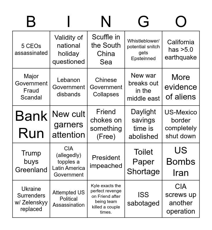 This bingo card has a free space and 24 words: CIA (allegedly) topples a Latin America Government, Attempted US Political Assassination, Chinese Government Collapses, Ukraine Surrenders w/ Zelenskyy replaced, California has >5.0 earthquake, 5 CEOs assassinated, Major Government Fraud Scandal, Validity of national holiday questioned, Daylight savings time is abolished, President impeached, New war breaks out in the middle east, Bank Run, Toilet Paper Shortage, US Bombs Iran, Lebanon Government disbands, ISS sabotaged, US-Mexico border completely shut down, Scuffle in the South China Sea, More evidence of aliens, New cult garners attention, CIA screws up another operation, Trump buys Greenland, Whistleblower/ potential snitch gets Epsteinned and Kyle exacts the perfect revenge on Friend after being team killed a couple times..