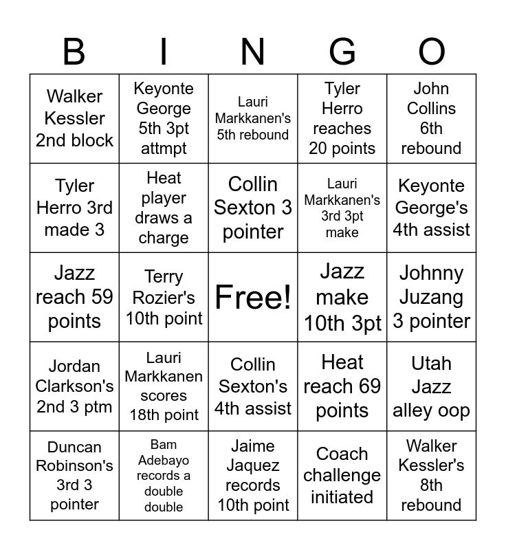 This bingo card has a free space and 24 words: Lauri Markkanen scores 18th point, Bam Adebayo records a double double, Collin Sexton 3 pointer, Duncan Robinson's 3rd 3 pointer, John Collins 6th rebound, Walker Kessler 2nd block, Tyler Herro 3rd made 3, Keyonte George 5th 3pt attmpt, Jazz make 10th 3pt, Collin Sexton's 4th assist, Lauri Markkanen's 3rd 3pt make, Jazz reach 59 points, Heat reach 69 points, Utah Jazz alley oop, Heat player draws a charge, Coach challenge initiated, Johnny Juzang 3 pointer, Lauri Markkanen's 5th rebound, Keyonte George's 4th assist, Terry Rozier's 10th point, Walker Kessler's 8th rebound, Jordan Clarkson's 2nd 3 ptm, Tyler Herro reaches 20 points and Jaime Jaquez records 10th point.