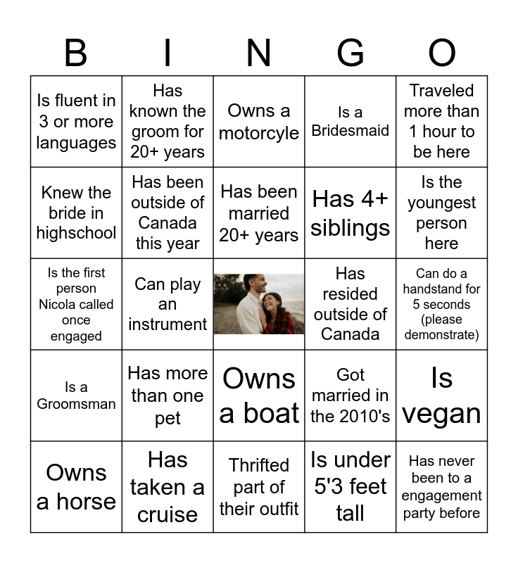 This bingo card has a free space and 24 words: Has more than one pet, Has taken a cruise, Has been married 20+ years, Owns a horse, Traveled more than 1 hour to be here, Is fluent in 3 or more languages, Knew the bride in highschool, Has known the groom for 20+ years, Has resided outside of Canada, Owns a boat, Has 4+ siblings, Is the first person Nicola called once engaged, Got married in the 2010's, Is vegan, Has been outside of Canada this year, Is under 5'3 feet tall, Can do a handstand for 5 seconds (please demonstrate), Owns a motorcyle, Is the youngest person here, Can play an instrument, Has never been to a engagement party before, Is a Groomsman, Is a Bridesmaid and Thrifted part of their outfit.