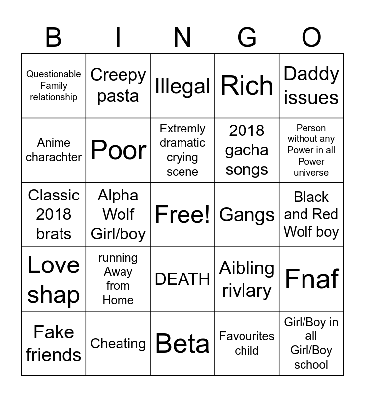 This bingo card has a free space and 24 words: running Away from Home, Cheating, Extremly dramatic crying scene, Fake friends, Daddy issues, Questionable Family relationship, Anime charachter, Creepy pasta, Gangs, DEATH, 2018 gacha songs, Classic 2018 brats, Aibling rivlary, Fnaf, Poor, Favourites child, Black and Red Wolf boy, Illegal, Person without any Power in all Power universe, Alpha Wolf Girl/boy, Girl/Boy in all Girl/Boy school, Love shap, Rich and Beta.