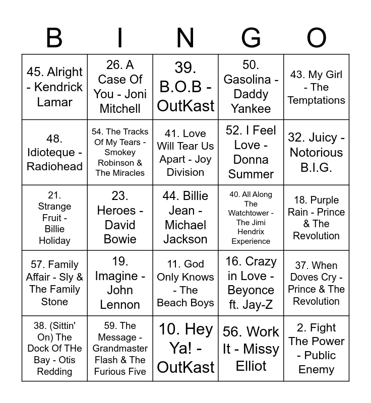 This bingo card has 60 words: 60. Running Up That Hill - Kate Bush, 59. The Message - Grandmaster Flash & The Furious Five, 58. The Weight - The Band, 57. Family Affair - Sly & The Family Stone, 56. Work It - Missy Elliot, 55. Like A Prayer - Madonna, 54. The Tracks Of My Tears - Smokey Robinson & The Miracles, 53. Good Vibrations - The Beach Boys, 52. I Feel Love - Donna Summer, 51. Walk On By - Dionne Warwick, 50. Gasolina - Daddy Yankee, 49. Doo Wop (That Thing) - Lauryn Hill, 48. Idioteque - Radiohead, 47. Tiny Dancer - Elton John, 46. Paper Planes - MIA, 45. Alright - Kendrick Lamar, 44. Billie Jean - Michael Jackson, 43. My Girl - The Temptations, 42. Redemption Song - Bob Marley & The Wailers, 41. Love Will Tear Us Apart - Joy Division, 40. All Along The Watchtower - The Jimi Hendrix Experience, 39. B.O.B - OutKast, 38. (Sittin' On) The Dock Of THe Bay - Otis Redding, 37. When Doves Cry - Prince & The Revolution, 36. Seven Nation Army - The White Stripes, 35. Tutti-Frutti - Little Richard, 34. Papa's Got A Brand New Bag - James Brown, 33. Johnny B. Goode - Chuck Berry, 32. Juicy - Notorious B.I.G., 31. (I Can't Get No) Satisfaction - The Rolling Stones, 30. Royals - Lorde, 29. Nuthin' But A G Thang - Dr. Dre ft. Snoop Dogg, 28. Once In A Lifetime - The Talking Heads, 27. Born To Run - Bruce Springsteen, 26. A Case Of You - Joni Mitchell, 25. Runaway - Kanye West ft. Pusha T, 24. A Day In The Life - The Beatles, 23. Heroes - David Bowie, 22. Be My Baby - The Ronettes, 21. Strange Fruit - Billie Holiday, 20. Dancing On My Own - Robyn, 19. Imagine - John Lennon, 18. Purple Rain - Prince & The Revolution, 17. Bohemian Rhapsody - Queen, 16. Crazy in Love - Beyonce ft. Jay-Z, 15. I Want To Hold Your Hand - The Beatles, 14. Waterloo Sunset - The Kinks, 13. Gimme Shelter - The Rolling Stones, 12. Superstition - Stevie Wonder, 11. God Only Knows - The Beach Boys, 10. Hey Ya! - OutKast, 9. Dreams - Fleetwood Mac, 8. Get Ur Freak On - Missy Elliot, 7. Strawberry Fields Forever - The Beatles, 6.What's Going On - Marvin Gaye, 5. Smells Like Teen Spirit - Nirvana, 4. Like A Rolling Stone - Bob Dylan, 3. A Change Is Gonna Come - Sam Cooke, 2. Fight The Power - Public Enemy and 1. Respect - Arethra Franklin.