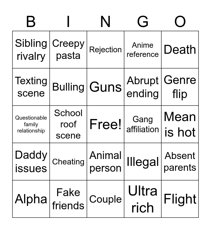 This bingo card has a free space and 24 words: Cheating, Fake friends, Guns, Alpha, Death, Sibling rivalry, Texting scene, Creepy pasta, Gang affiliation, Animal person, Abrupt ending, Questionable family relationship, Illegal, Absent parents, Bulling, Ultra rich, Mean is hot, Rejection, Genre flip, School roof scene, Flight, Daddy issues, Anime reference and Couple.