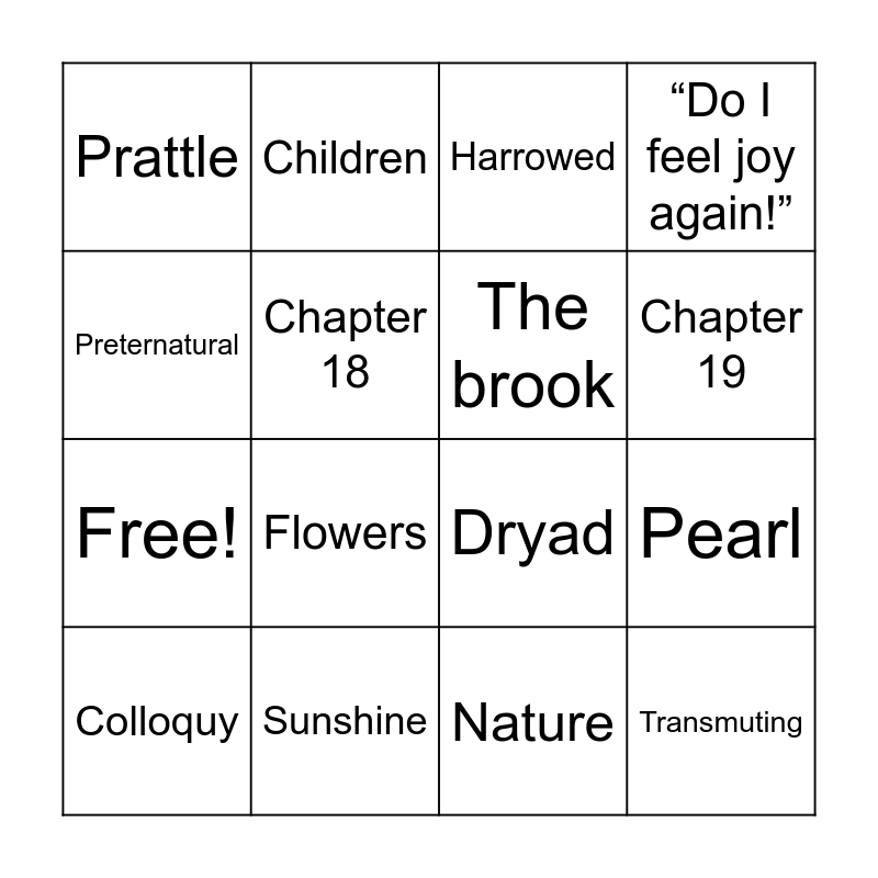 This bingo card has 20 words: Pearl, Scarlet letter, Harrowed, Denizen, Colloquy, Preternatural, Sunshine, Prattle, Free!, Children, Flowers, Dryad, Chapter 18, Transmuting, The brook, Kiss, Chapter 19, “Do I feel joy again!”, Nature and “Thou must know Pearl!”.