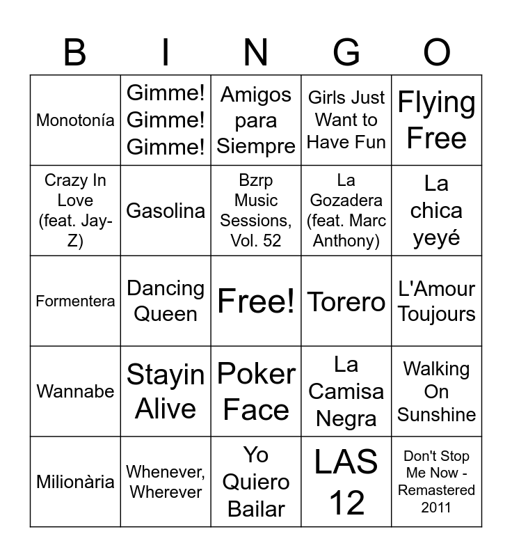 This bingo card has a free space and 75 words: A quién le importa, All I Want for Christmas Is You, Amigos para Siempre, Aserejé, Ave María, Ay Mamá, Baby One More Time, Believe, Billie Jean, Blame It on the Boogie, Blinding Lights, Bonito, Bzrp Music Sessions, Vol. 52, Crazy In Love (feat. Jay-Z), Cuando zarpa el amor, Dancing Queen, DESPECHÁ, Don't Stop Me Now - Remastered 2011, Fiesta Pagana, Flying Free, Follow the Leader "Sigue al lider", Formentera, Gasolina, Gimme! Gimme! Gimme!, Girls Just Want to Have Fun, Hay que venir al sur, I Gotta Feeling, I Wanna Dance with Somebody (Who Loves Me), I Want It That Way, I Will Survive, It's My Life, It's Raining Men, La Bomba, La Camisa Negra, La chica yeyé, La Gozadera (feat. Marc Anthony), La Revolución Sexual, Lady Marmalade, L'Amour Toujours, LAS 12, Livin' la Vida Loca, Macarena, Mambo No. 5 (a Little Bit of...), Mari Carmen, Me Colé en una Fiesta, Mi gran noche, Milionària, Monotonía, Olvídame y Pega la Vuelta, Para No Verte Más, Pepas, Poker Face, Por la Raja de Tu Falda, Princesas, Que La Detengan, Ritmo De La Noche, Salta!!!, Sarandonga, Saturday Night, Solo Se Vive una Vez, Stayin Alive, Suavemente, Tacones Rojos, The Final Countdown, Todos los días sale el sol, Torero, Total Eclipse of the Heart,, Viva La Vida, Vivir Mi Vida, Walking On Sunshine, Wannabe, Whenever, Wherever, YMCA, Yo Quiero Bailar and You're The One That I Want - From “Grease”.