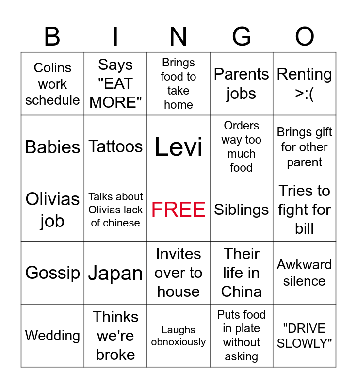 This bingo card has a free space and 24 words: Wedding, Japan, Levi, Puts food in plate without asking, Renting >:(, Colins work schedule, Says "EAT MORE", Brings food to take home, Siblings, Tries to fight for bill, Olivias job, Tattoos, Their life in China, Awkward silence, Babies, Thinks we're broke, Laughs obnoxiously, Parents jobs, Brings gift for other parent, Gossip, Talks about Olivias lack of chinese, Invites over to house, Orders way too much food and "DRIVE SLOWLY".
