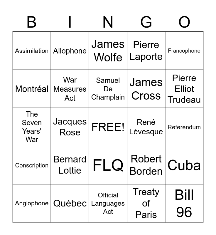 This bingo card has a free space and 34 words: Confederation, Treaty of Paris, Quiet Revolution, Sovereignty, Conscription, War Measures Act, Francophone, Anglophone, Allophone, Biligualism, Samuel De Champlain, James Wolfe, Sir Wilfred Laurier, Louis Riel, René Lévesque, Pierre Elliot Trudeau, Québec, The Seven Years' War, Bernard Lottie, Robert Borden, FLQ, New France, Assimilation, Referendum, Official Languages Act, Bill 96, Pierre Laporte, Robert Bourassa, James Cross, Montréal, Simards, Jacques Rose, Cuba and Separatism.