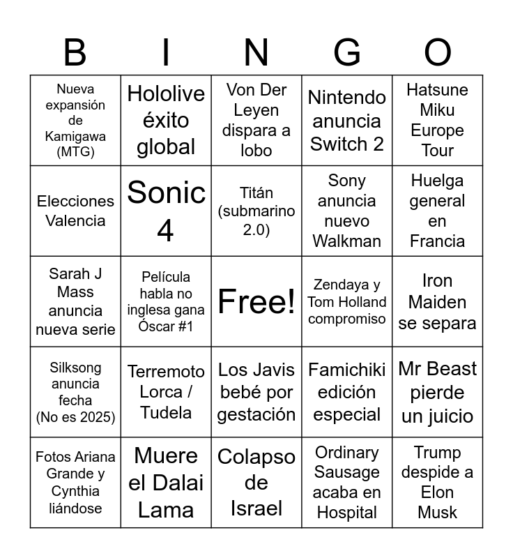 This bingo card has a free space and 24 words: Terremoto Lorca / Tudela, Muere el Dalai Lama, Titán (submarino 2.0), Fotos Ariana Grande y Cynthia liándose, Hatsune Miku Europe Tour, Nueva expansión de Kamigawa (MTG), Elecciones Valencia, Hololive éxito global, Zendaya y Tom Holland compromiso, Los Javis bebé por gestación, Sony anuncia nuevo Walkman, Sarah J Mass anuncia nueva serie, Famichiki edición especial, Mr Beast pierde un juicio, Sonic 4, Ordinary Sausage acaba en Hospital, Iron Maiden se separa, Von Der Leyen dispara a lobo, Huelga general en Francia, Película habla no inglesa gana Óscar #1, Trump despide a Elon Musk, Silksong anuncia fecha (No es 2025), Nintendo anuncia Switch 2 and Colapso de Israel.