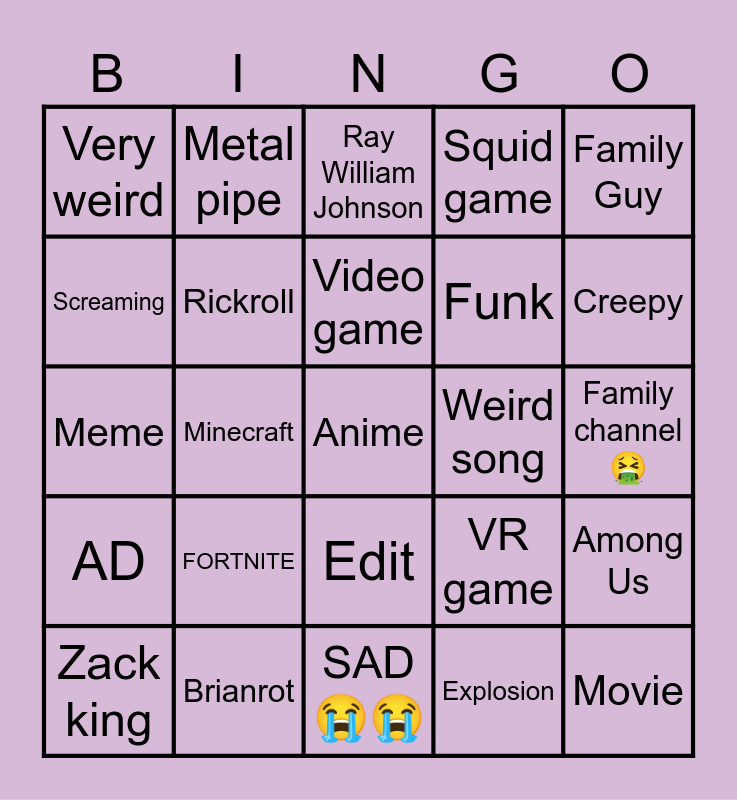 This bingo card has a free space and 24 words: FORTNITE, Brianrot, Video game, Zack king, Family Guy, Very weird, Screaming, Metal pipe, Weird song, Edit, Funk, Meme, VR game, Among Us, Rickroll, Explosion, Family channel 🤮, Ray William Johnson, Creepy, Minecraft, Movie, AD, Squid game and SAD 😭😭.