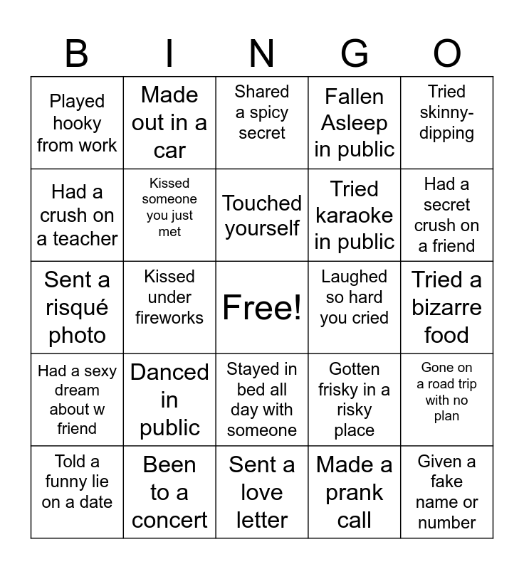 This bingo card has a free space and 24 words: Danced in public, Been to a concert, Touched yourself, Told a funny lie on a date, Tried skinny-dipping, Played hooky from work, Had a crush on a teacher, Made out in a car, Laughed so hard you cried, Stayed in bed all day with someone, Tried karaoke in public, Sent a risqué photo, Gotten frisky in a risky place, Gone on a road trip with no plan, Kissed someone you just met, Made a prank call, Tried a bizarre food, Shared a spicy secret, Had a secret crush on a friend, Kissed under fireworks, Given a fake name or number, Had a sexy dream about w friend, Fallen Asleep in public and Sent a love letter.