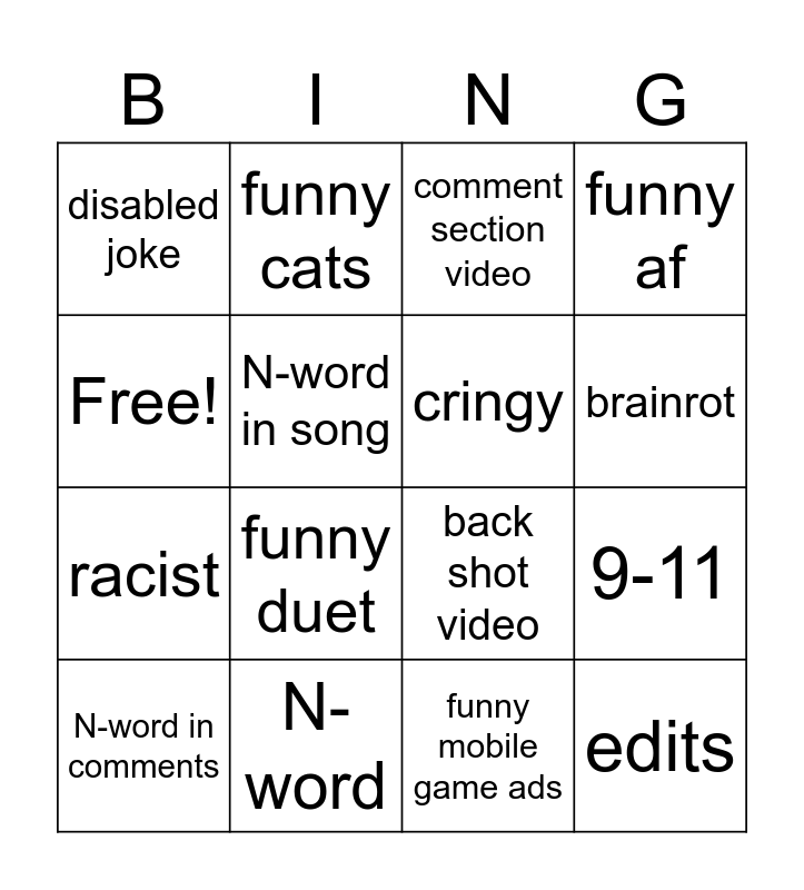 This bingo card has 16 words: N-word, 9-11, comment section video, disabled joke, racist, funny cats, back shot video, funny mobile game ads, Free!, N-word in song, N-word in comments, funny af, funny duet, brainrot, cringy and edits.