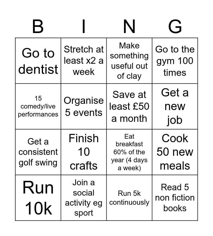 This bingo card has 17 words: Run 5k continuously, Run 10k, Make something useful out of clay, Go to dentist, Finish 10 crafts, Go to the gym 100 times, Cook 50 new meals, Save at least £50 a month, Get a new job, Organise 5 events, Join a social activity eg sport, Eat breakfast 60% of the year (4 days a week), 15 comedy/live performances, Stretch at least x2 a week, Get a consistent golf swing, Take pictures at every social gathering and Read 5 non fiction books.