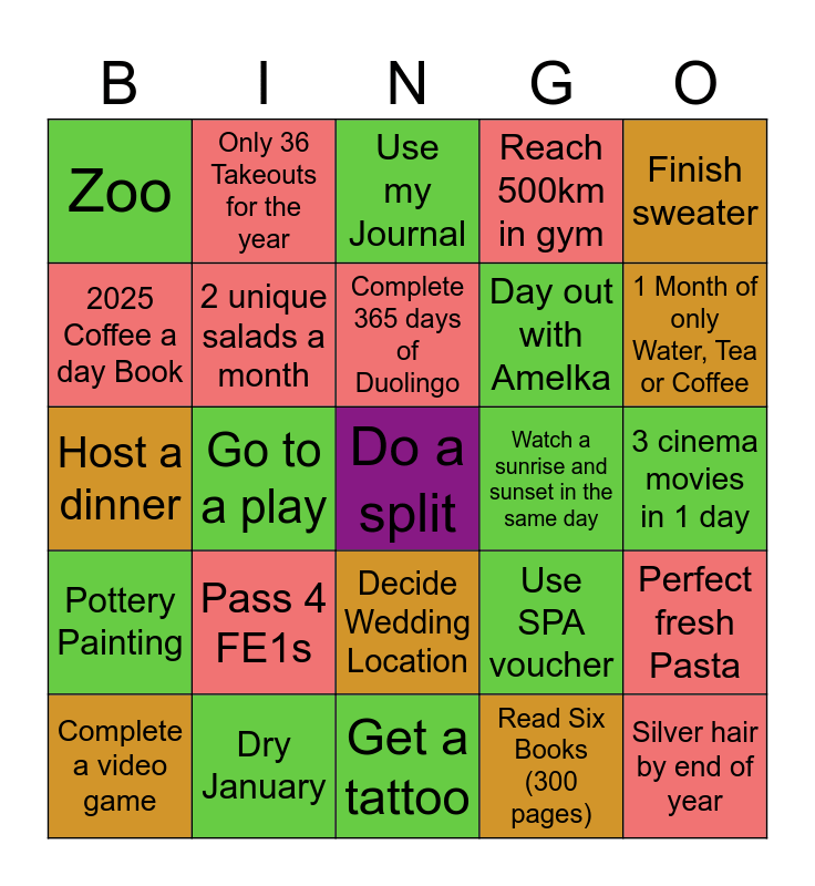 This bingo card has a free space and 24 words: Pass 4 FE1s, Dry January, Complete 365 days of Duolingo, Complete a video game, Finish sweater, Zoo, 2025 Coffee a day Book, Only 36 Takeouts for the year, Watch a sunrise and sunset in the same day, Decide Wedding Location, Day out with Amelka, Host a dinner, Use SPA voucher, Perfect fresh Pasta, 2 unique salads a month, Read Six Books (300 pages), 3 cinema movies in 1 day, Use my Journal, 1 Month of only Water, Tea or Coffee, Go to a play, Silver hair by end of year, Pottery Painting, Reach 500km in gym and Get a tattoo.