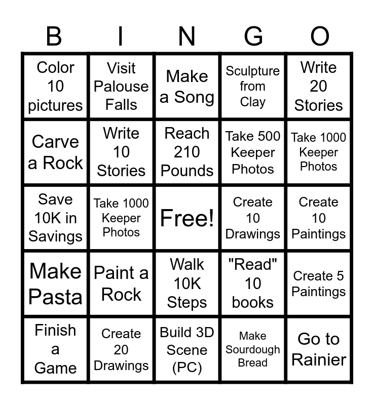 This bingo card has a free space and 24 words: Paint a Rock, Create 20 Drawings, Reach 210 Pounds, Finish a Game, Write 20 Stories, Color 10 pictures, Carve a Rock, Visit Palouse Falls, Create 10 Drawings, Walk 10K Steps, Take 500 Keeper Photos, Save 10K in Savings, "Read" 10 books, Create 5 Paintings, Write 10 Stories, Make Sourdough Bread, Create 10 Paintings, Make a Song, Take 1000 Keeper Photos, Take 1000 Keeper Photos, Go to Rainier, Make Pasta, Sculpture from Clay and Build 3D Scene (PC).