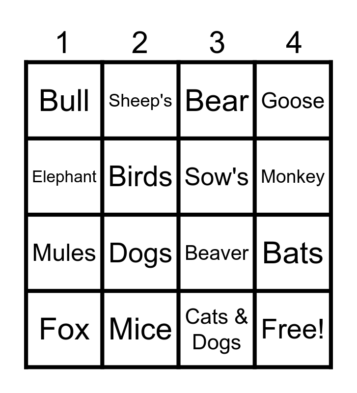 This bingo card has 23 words: Free!, Bird, Monkey, Horse, Elephant, Bull, Birds, Sheep's, Fox, Pigeon, Dogs, Mules, Lamb, Camel, Mice, Beast, Bear, Beaver, Sow's, Bats, Goose, Cats & Dogs and Pig.