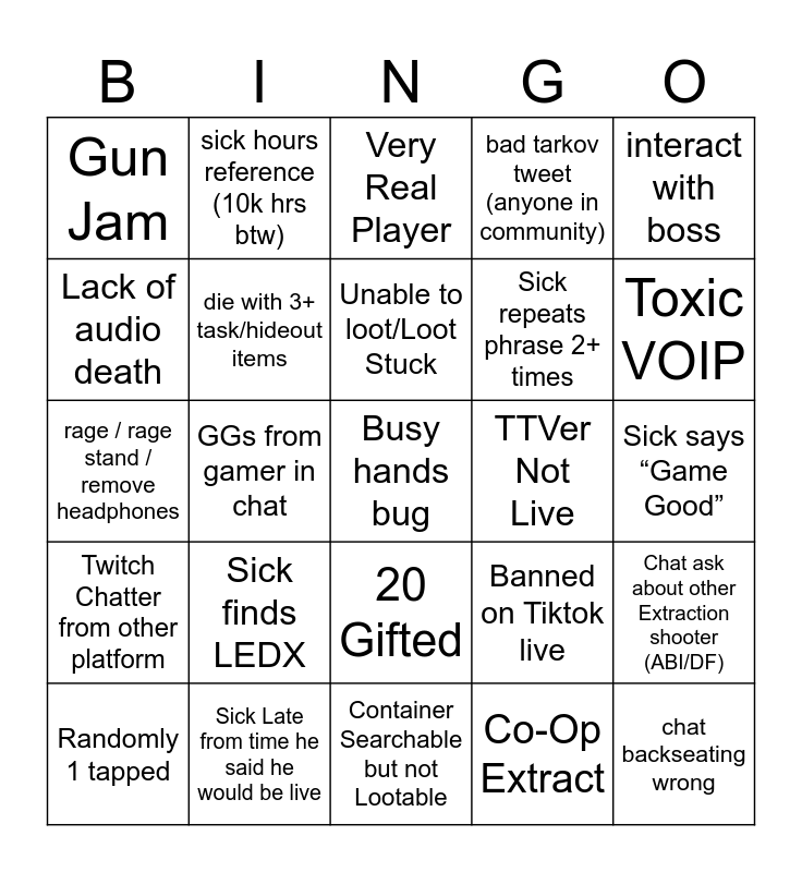 This bingo card has 76 words: SCAV SAYS "WOW PA SONGA TOE" "CHEEKI BREEKI", Any Audio Issue, Very Real Player, Flying cheater, Desync Death, Friendly Betrayal, 300HR GAMER, RACIST NAME, game crash, skating/stutter/rubber band, chat backseating wrong, matching bug/load in issue, Unable to loot/Loot Stuck, Lack of audio death, Scav shooting through walls/without sight, GGs from gamer in chat, Scav Instant 1 tap, Busy hands bug, poor comms (playing with people), interact with boss, 5 deaths in a row, rage / rage stand / remove headphones, die with 3+ task/hideout items, sick hours reference (10k hrs btw), bad tarkov tweet (anyone in community), bullet pen armor that DEFINITELY makes sense, 1 bullet sound hit by 5 / bullet bug, 1776 bitties!, 5 gifted, italy mention / sopranos, rall = weeb, unprepared for raid (forgot something), wrestling mention, Banned on Tiktok live, Toxic VOIP, Sick repeats phrase 2+ times, Sick says “what are we doing???”, blank stare / non verbal/ head bash wall, Sick says “Game Good”, Co-Op Extract, Servers Broken, Silent Nade, Sick Angrily says “Clip that!!!”, Sick plugs Youtube video/Tiktok, Kaylonator makes Sick laugh, ALT+F4 game, Randomly 1 tapped, Gun Jam, Kappa Item Deleted, 1 Gifted, 10 Gifted, 20 Gifted, Sick “Got Ratted”, Sub 30 Second Raid, Stream Sniper, Zune Spotting in Chat, Enemy should have died moment, Impossible daily/weekly, Scav walks through door, Scav randomly aggros after being peaceful, Sick finds LEDX, Sick finds GPU, Sick finds Bitcoin, Sick Throws Bad Nade, Successful Wizard, Unsuccessful Wizard, TTVer Not Live, Sick loses backpack, MommaDegen Spotting, Emergency two-ski, Chat ask about other Extraction shooter (ABI/DF), Twitch Chatter from other platform, Sick Late from time he said he would be live, Sick makes fun of fellow Tarkov creator, Container Searchable but not Lootable and TK incident.