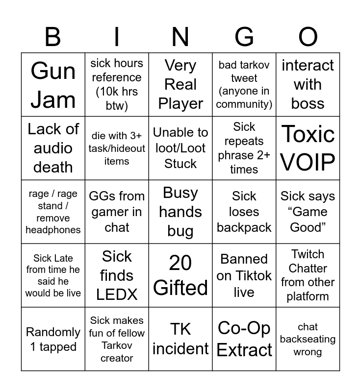 This bingo card has 77 words: SCAV SAYS "WOW PA SONGA TOE" "CHEEKI BREEKI", Any Audio Issue, Very Real Player, Flying cheater, Desync Death, Friendly Betrayal, 300HR GAMER, RACIST NAME, game crash, skating/stutter/rubber band, chat backseating wrong, matching bug/load in issue, Unable to loot/Loot Stuck, Lack of audio death, Scav shooting through walls/without sight, GGs from gamer in chat, Scav Instant 1 tap, Busy hands bug, poor comms (playing with people), interact with boss, 5 deaths in a row, rage / rage stand / remove headphones, die with 3+ task/hideout items, sick hours reference (10k hrs btw), bad tarkov tweet (anyone in community), bullet pen armor that DEFINITELY makes sense, 1 bullet sound hit by 5 / bullet bug, 1776 bitties!, 5 gifted, italy mention / sopranos, rall = weeb, unprepared for raid (forgot something), wrestling mention, Banned on Tiktok live, Toxic VOIP, Sick repeats phrase 2+ times, Sick says “what are we doing???”, blank stare / non verbal/ head bash wall, Sick says “Game Good”, Co-Op Extract, Servers Broken, Silent Nade, Sick Angrily says “Clip that!!!”, Sick plugs Youtube video/Tiktok, Kaylonator makes Sick laugh, ALT+F4 game, Randomly 1 tapped, Gun Jam, Kappa Item Deleted, 1 Gifted, 10 Gifted, 20 Gifted, Sick “Got Ratted”, Sub 30 Second Raid, Stream Sniper, Zune Spotting in Chat, Enemy should have died moment, Impossible daily/weekly, Scav walks through door, Scav randomly aggros after being peaceful, Sick finds LEDX, Sick finds GPU, Sick finds Bitcoin, Sick Throws Bad Nade, Successful Wizard, Unsuccessful Wizard, TTVer Not Live, Sick loses backpack, MommaDegen Spotting, Emergency two-ski, Chat ask about other Extraction shooter (ABI/DF), Twitch Chatter from other platform, Sick Late from time he said he would be live, Sick makes fun of fellow Tarkov creator, Container Searchable but not Lootable, TK incident and Sick asks chat what he should eat.