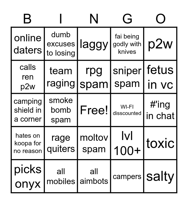 This bingo card has a free space and 24 words: rage quiters, all mobiles, rpg spam, picks onyx, p2w, online daters, calls ren p2w, dumb excuses to losing, WI-FI disscounted, moltov spam, sniper spam, camping shield in a corner, lvl 100+, toxic, team raging, campers, #'ing in chat, laggy, fetus in vc, smoke bomb spam, salty, hates on koopa for no reason, fai being godly with knives and all aimbots.