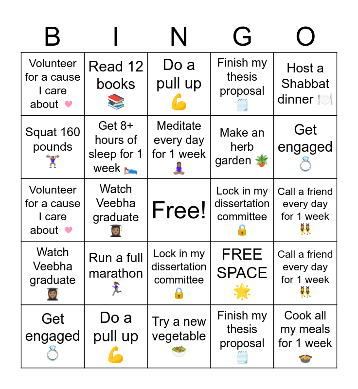 This bingo card has 50 words: Make a new recipe π©π½βπ³, Run a full marathon ππ½ββοΈ, Get a drivers license π, Finish my thesis proposal ποΈ, Call a friend every day for 1 week π―ββοΈ, Get standing crow in yoga πͺ·, Read 12 books π, Try a new vegetable π₯, Make an herb garden πͺ΄, Cook all my meals for 1 week π², Volunteer for a cause I care about π©·, Get 8+ hours of sleep for 1 week π, Free!, FREE SPACE π, Travel to 2 continents βοΈ, Go to the temple ποΈ, Watch Veebha graduate π©π½βπ, Meditate every day for 1 week π§π½ββοΈ, Run 10 miles without stopping π, Host a Shabbat dinner π½οΈ, Squat 160 pounds ππ½ββοΈ, Be fully sober for 3 monthsπΈ, Do a pull up πͺ, Lock in my dissertation committee π, Take my mom out to dinner π, Get engaged π, Run a full marathon ππ½ββοΈ, Get a drivers license π, Finish my thesis proposal ποΈ, Call a friend every day for 1 week π―ββοΈ, Make a new recipe π©π½βπ³, Read 12 books π, Try a new vegetable π₯, Make an herb garden πͺ΄, Cook all my meals for 1 week π², Get standing crow in yoga πͺ·, Get 8+ hours of sleep for 1 week π, Travel to 2 continents βοΈ, Go to the temple ποΈ, Volunteer for a cause I care about π©·, Meditate every day for 1 week π§π½ββοΈ, Run 10 miles without stopping π, Host a Shabbat dinner π½οΈ, Squat 160 pounds ππ½ββοΈ, Watch Veebha graduate π©π½βπ, Do a pull up πͺ, Lock in my dissertation committee π, Take my mom out to dinner π, Get engaged π and Be fully sober for 3 monthsπΈ.