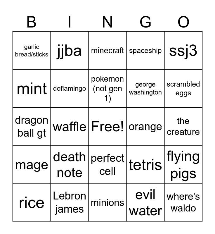 This bingo card has a free space and 24 words: death note, Lebron james, pokemon (not gen 1), rice, ssj3, garlic bread/sticks, mint, jjba, orange, perfect cell, george washington, dragon ball gt, tetris, flying pigs, doflamingo, evil water, the creature, minecraft, scrambled eggs, waffle, where's waldo, mage, spaceship and minions.