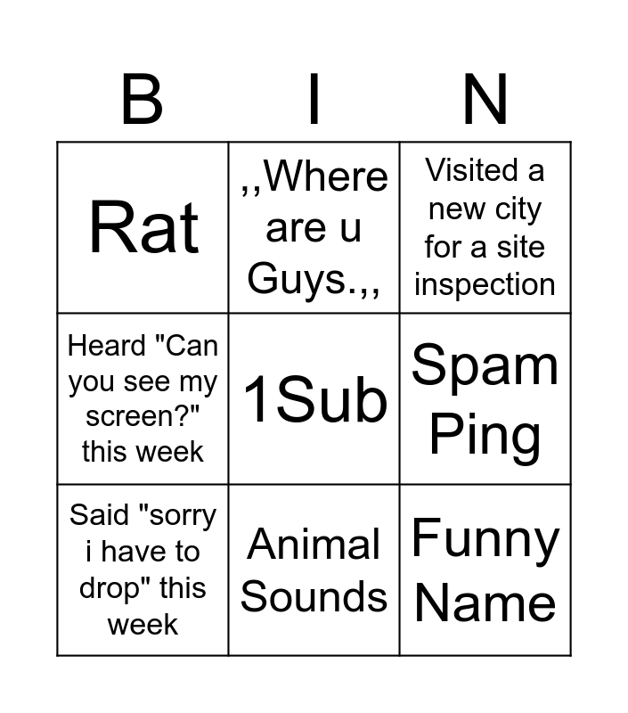 This bingo card has a free space and 24 words: First Knock, 1 Clip, Animal Sounds, AFK Mate, Funny Name, Rat, Spam Ping, ,,Where are u Guys.,,, Said "Can you hear me now?" this week, UW Chase's first of a deal, Rate lock delay due to Flood Insurance, Made your bed this morning, Have a pet, Is the youngest child, Said "sorry i have to drop" this week, Attended an EAW lunch/event, Know how to ride a bike, Visited a new city for a site inspection, Rate lock delay due to KYC, Wore sweatpants yesterday, Has said "you're on mute", Avg commute is >30 mins, Heard "Can you see my screen?" this week and Experienced a natural weather alert this year.