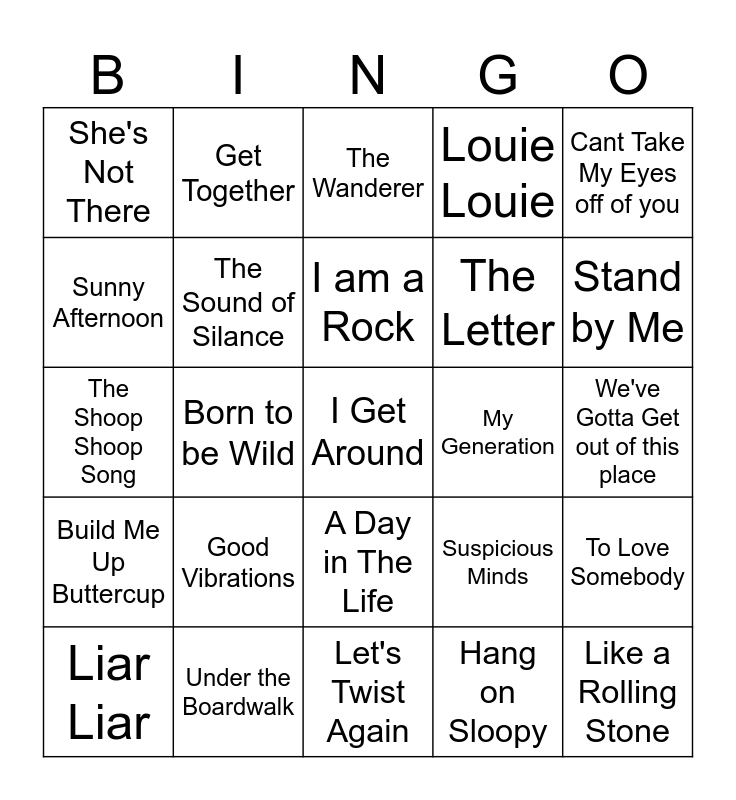 This bingo card has 25 words: Good Vibrations, Let's Twist Again, I am a Rock, Liar Liar, Cant Take My Eyes off of you, She's Not There, Sunny Afternoon, Get Together, My Generation, A Day in The Life, The Letter, The Shoop Shoop Song, Suspicious Minds, To Love Somebody, The Sound of Silance, Like a Rolling Stone, We've Gotta Get out of this place, The Wanderer, Stand by Me, Born to be Wild, I Get Around, Under the Boardwalk, Build Me Up Buttercup, Louie Louie and Hang on Sloopy.