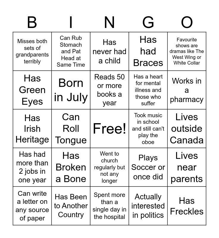 This bingo card has a free space and 24 words: Has Broken a Bone, Has Been to Another Country, Reads 50 or more books a year, Can write a letter on any source of paper, Favourite shows are dramas like The West Wing or White Collar, Misses both sets of grandparents terribly, Has Green Eyes, Can Rub Stomach and Pat Head at Same Time, Took music in school and still can't play the oboe, Went to church regularly but not any longer, Has a heart for mental illness and those who suffer, Has Irish Heritage, Plays Soccer or once did, Lives near parents, Born in July, Actually interested in politics, Lives outside Canada, Has never had a child, Works in a pharmacy, Can Roll Tongue, Has Freckles, Has had more than 2 jobs in one year, Has had Braces and Spent more than a single day in the hospital.