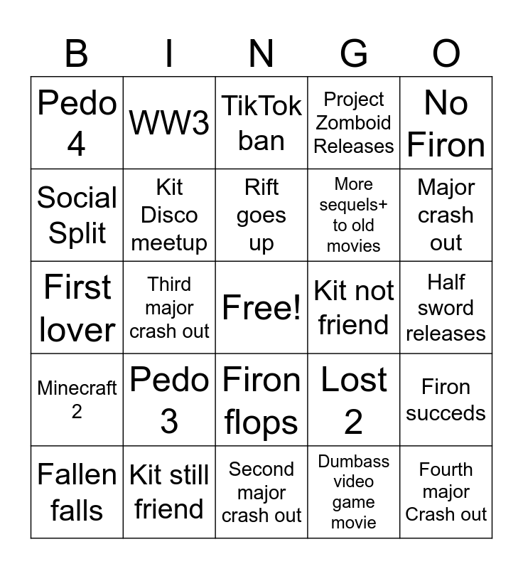 This bingo card has a free space and 24 words: Pedo 3, Kit still friend, Rift goes up, Fallen falls, No Firon, Pedo 4, Social Split, WW3, Kit not friend, Firon flops, More sequels+ to old movies, First lover, Lost 2, Firon succeds, Kit Disco meetup, Dumbass video game movie, Half sword releases, TikTok ban, Major crash out, Third major crash out, Fourth major Crash out, Minecraft 2, Project Zomboid Releases and Second major crash out.