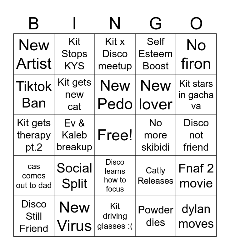 This bingo card has a free space and 24 words: Social Split, New Virus, New Pedo, Disco Still Friend, No firon, New Artist, Tiktok Ban, Kit Stops KYS, No more skibidi, Disco learns how to focus, New lover, Kit gets therapy pt.2, Catly Releases, Fnaf 2 movie, Kit gets new cat, Powder dies, Disco not friend, Kit x Disco meetup, Kit stars in gacha va, Ev & Kaleb breakup, dylan moves, cas comes out to dad, Self Esteem Boost and Kit driving glasses :(.
