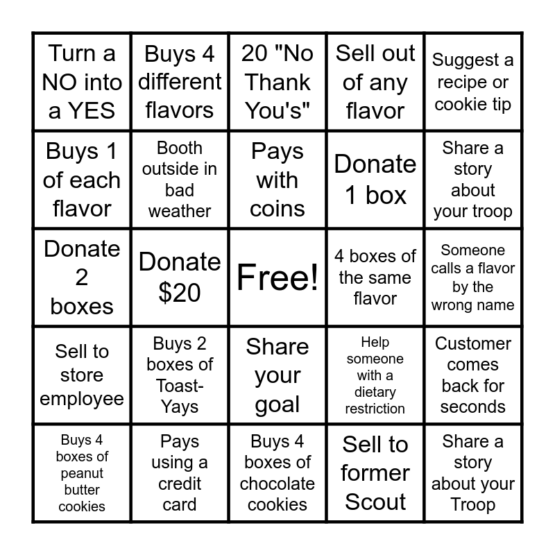 This bingo card has a free space and 28 words: Customer comes back for seconds, Buys 1 case or 12 packs, Donate 1 box, Sell to former Scout, Buys 1 of each flavor, 20 "No Thank You's", Buys 4 different flavors, Sell to store employee, 4 boxes of the same flavor, Buys 4 boxes of peanut butter cookies, Donate 2 boxes, Sell out of any flavor, Pays using a credit card, Buys 4 boxes of chocolate cookies, Share a story about your troop, Buys only Lemonades, Buys 2 boxes of Toast-Yays, Booth outside in bad weather, Pays with coins, Share your goal, Turn a NO into a YES, Share why we are raising money, Share a story about your Troop, Donate $20, Someone calls a flavor by the wrong name, Help someone with a dietary restriction, Suggest a recipe or cookie tip and Sell to someone who tells you about a cheaper dupe.