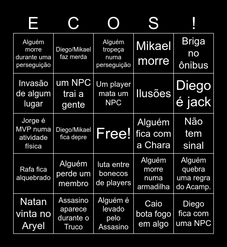 This bingo card has a free space and 24 words: Alguém perde um membro, Assasino aparece durante o Truco, Um player mata um NPC, Natan vinta no Aryel, Briga no ônibus, Alguém morre durante uma perseguição, Invasão de algum lugar, Diego/Mikael faz merda, Alguém fica com a Chara, luta entre bonecos de players, Ilusões, Jorge é MVP numa atividade física, Alguém morre numa armadilha, Alguém quebra uma regra do Acamp., um NPC trai a gente, Caio bota fogo em algo, Não tem sinal, Alguém tropeça numa perseguição, Diego é jack, Diego/Mikael fica depre, Diego fica com uma NPC, Rafa fica alquebrado, Mikael morre and Alguém é levado pelo Assasino.