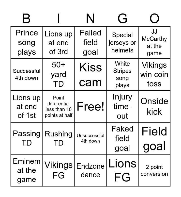This bingo card has a free space and 29 words: Eminem at the game, JJ does a dance, Point differential less than 10 points at half, Cars drive on the field, Prince song plays, Failed field goal, 50+ yard TD, Rushing TD, Injury time-out, Vikings FG, Onside kick, 2 point conversion, Endzone dance, Lions FG, Vikings win coin toss, Safety, Unsuccessful 4th down, Passing TD, JJ McCarthy at the game, Lions up at end of 1st, Faked field goal, Vikings up at halftime, White Stripes song plays, Successful 4th down, Special jerseys or helmets, Lions up at end of 3rd, Field goal, Kiss cam and Vikings score first.