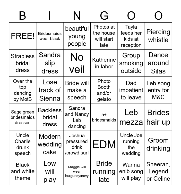 This bingo card has 36 words: EDM, Joshua pressured drink /crowd surf, Bride running late, Strapless bridal dress, Sage green bridesmaids dresses, Photo Booth and/or gelato, Sandra slip dress, Maggie will wear burgundy/navy, Tayla feeds her kids at reception, Uncle Joe running the wedding, Dance around Silas, Photos at the house will start late, Groom drinking, Lose track of Sienna, Katherine in labor, FREE!, Uncle Charlie drunk speech, Dad impatient to leave, Over the top dancing by MotB, beautiful young people, Bride will make a speech, Backless bridal dress, 5+ bridesmaids, Sandra and Nancy Leb dancing, Leb mezza, Bridesmaids wear black, Group smoking outside, Low will play, No veil, Piercing whistle, Sheeran, Legend or Celine, Black and white theme, Brides hair up, Leb song entry for M&C, Modern wedding cake and Wanna enib song will play.