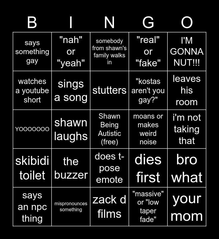 This bingo card has a free space and 24 words: the buzzer, mispronounces something, stutters, says an npc thing, I'M GONNA NUT!!!, says something gay, watches a youtube short, "nah" or "yeah", moans or makes weird noise, does t-pose emote, "kostas aren't you gay?", YOOOOOOO, dies first, bro what, sings a song, "massive" or "low taper fade", i'm not taking that, somebody from shawn's family walks in, leaves his room, shawn laughs, your mom, skibidi toilet, "real" or "fake" and zack d films.