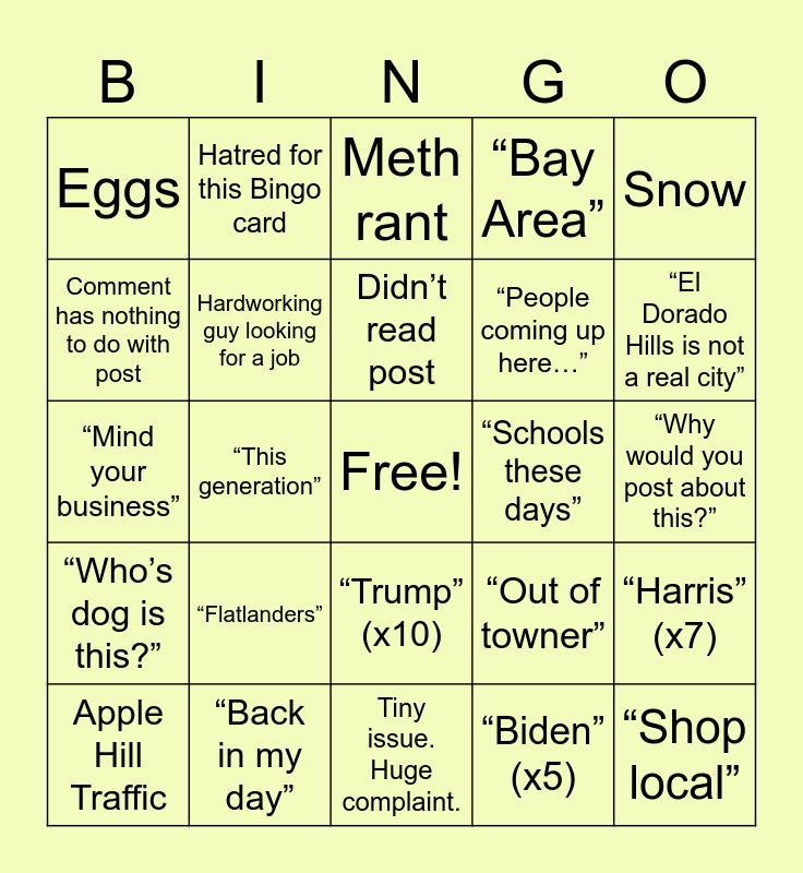This bingo card has a free space and 24 words: “Flatlanders”, “Back in my day”, Didn’t read post, Apple Hill Traffic, Snow, Eggs, Comment has nothing to do with post, Hatred for this Bingo card, “Schools these days”, “Trump” (x10), “People coming up here…”, “Mind your business”, “Out of towner”, “Harris” (x7), Hardworking guy looking for a job, “Biden” (x5), “Why would you post about this?”, Meth rant, “El Dorado Hills is not a real city”, “This generation”, “Shop local”, “Who’s dog is this?”, “Bay Area” and Tiny issue. Huge complaint..