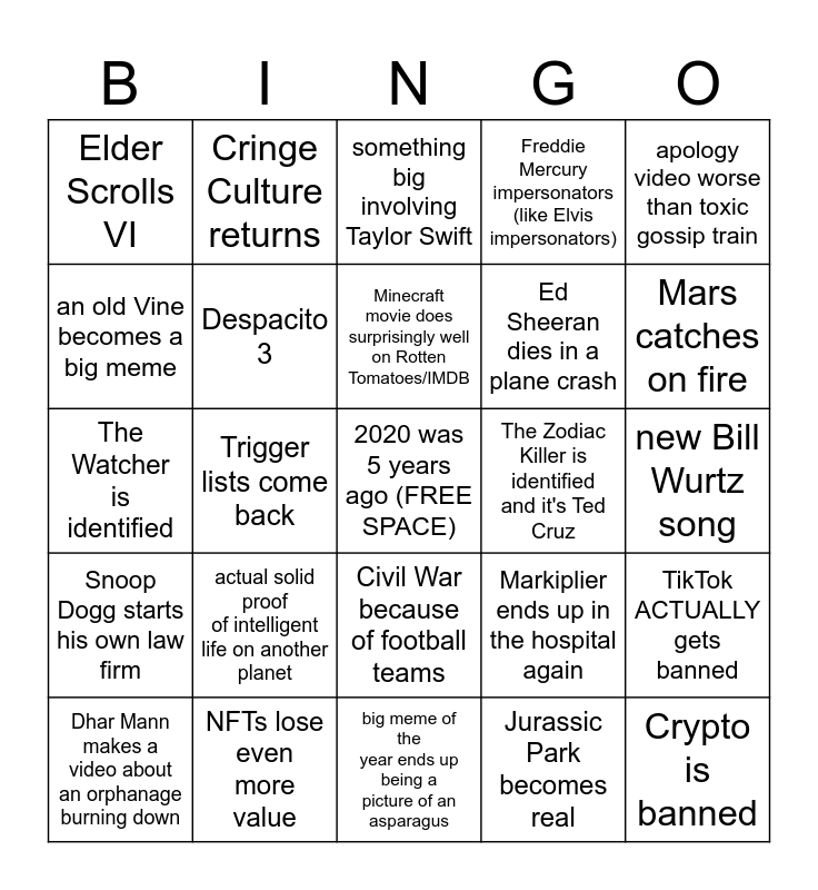 This bingo card has a free space and 64 words: Government official dies or gets assassinated, Celebrity under the age of 40 dies, Second Coming / The Rapture, TikTok ACTUALLY gets banned, Coronavirus 2, OG YouTuber retires, Cringe Culture returns, Donald Trump says something weird at inauguration, Minecraft movie does surprisingly well on Rotten Tomatoes/IMDB, DEVASTATING natural disaster, Civil War because of football teams, Barbenheimer 2, new Bill Wurtz song, apology video worse than toxic gossip train, Mt. Fuji erupts, an old Vine becomes a big meme, Trigger lists come back, Elder Scrolls VI, Michael Cera comes out as trans, Ed Sheeran dies in a plane crash, actual solid proof of intelligent life on another planet, Snoop Dogg starts his own law firm, Freddie Mercury impersonators (like Elvis impersonators), rapper beef bigger than Kendrick vs. Drake, Canadian province becomes an American state, Half Life 3, Deltarune Ch. 3 & 4 do NOT have a Tumblr sexyman, Scott Pilgrim Takes Off season 2, Twitter shuts down, Epic Games messes Fortnite up so badly that nobody plays it anymore, Robert Downey Jr. gets charged with embezzlement, new Lemon Demon album, Tally Hall gets back together, Joe Biden reveals that he was secretly Ronald Reagan the whole time, Mars catches on fire, Dhar Mann makes a video about an orphanage burning down, We finally find out what happened to MH370, Jurassic Park becomes real, Gangnam Style 2, Despacito 3, The Watcher is identified, The Zodiac Killer is identified and it's Ted Cruz, The Zodiac Killer is identified and it's NOT Ted Cruz, Dan "D.B." Cooper is identified, Luigi Mangione is pardoned / escapes / gets released from prison, Crypto is banned, NFTs lose even more value, new FNAF game, Markiplier ends up in the hospital again, Notre Dame explodes, White House grows legs and moves to Canada, Skyrim movie, big meme of the year ends up being a picture of an asparagus, Jojo Siwa gets even worse, entirety of the UK disappears off the face of the Earth, Russia gets its own continent, something big involving Taylor Swift, new species of fish gets discovered, sun blows up early, Hawk Tuah girl ends up homeless, Skibidi Toilet stops being relevant, Chappell Roan starts her own crypto scam, Bruno Mars makes a music video with Paul McCartney and Madagascar starts floating away.