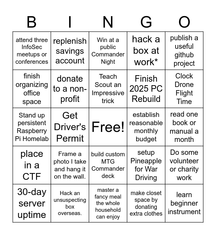 This bingo card has a free space and 24 words: Frame a photo I take and hang it on the wall., Hack an unsuspecting box overseas., Teach Scout an Impressive trick, 30-day server uptime, publish a useful github project, attend three InfoSec meetups or conferences, finish organizing office space, replenish savings account, establish reasonable monthly budget, build custom MTG Commander deck, Finish 2025 PC Rebuild, Stand up persistent Raspberry Pi Homelab, setup Pineapple for War Driving, Do some volunteer or charity work, donate to a non-profit, make closet space by donating extra clothes, read one book or manual a month, Win at a public Commander Night, Clock Drone Flight Time, Get Driver's Permit, learn beginner instrument, place in a CTF, hack a box at work* and master a fancy meal the whole household can enjoy.