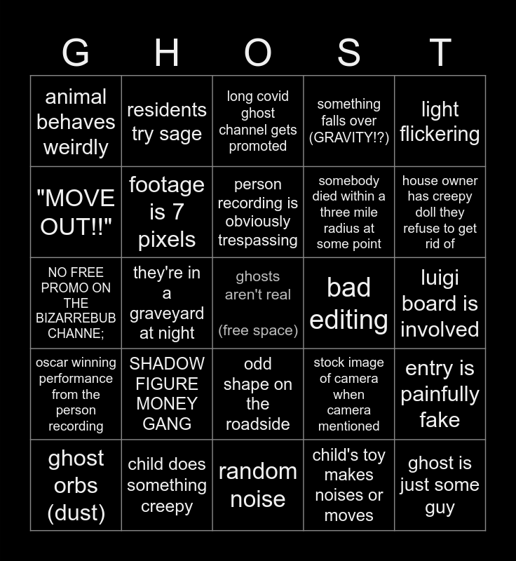 This bingo card has a free space and 24 words: SHADOW FIGURE MONEY GANG, child does something creepy, person recording is obviously trespassing, ghost orbs (dust), light flickering, animal behaves weirdly, "MOVE OUT!!", residents try sage, bad editing, odd shape on the roadside, somebody died within a three mile radius at some point, NO FREE PROMO ON THE BIZARREBUB CHANNE;, stock image of camera when camera mentioned, entry is painfully fake, footage is 7 pixels, child's toy makes noises or moves, luigi board is involved, long covid ghost channel gets promoted, house owner has creepy doll they refuse to get rid of, they're in a graveyard at night, ghost is just some guy, oscar winning performance from the person recording, something falls over (GRAVITY!?) and random noise.