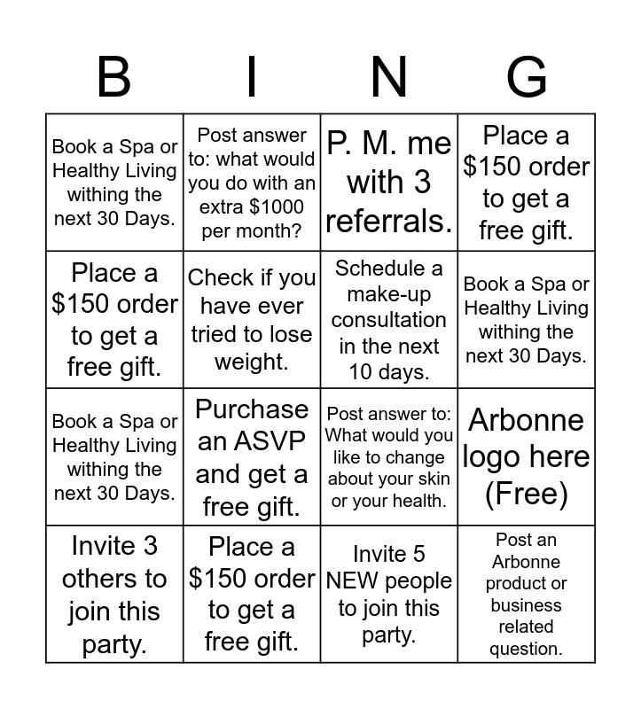 This bingo card has a free space and 15 words: Invite 3 others to join this party., Post an Arbonne product or business related question., P. M. me with 3 referrals., Book a Spa or Healthy Living withing the next 30 Days., Book a Spa or Healthy Living withing the next 30 Days., Place a $150 order to get a free gift., Purchase an ASVP and get a free gift., Invite 5 NEW people to join this party., Check if you have ever tried to lose weight., Book a Spa or Healthy Living withing the next 30 Days., Arbonne logo here (Free), Place a $150 order to get a free gift., Schedule a make-up consultation in the next 10 days., Post answer to: what would you do with an extra $1000 per month? and Place a $150 order to get a free gift..